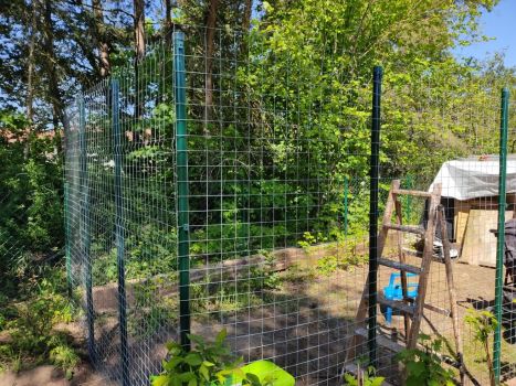So ein Zaun, vor allem in dieser Größe, kann ganz schnell teuer werden. Wir behelfen uns, in dem wir statt Zaunfeldern Estrich- oder Armierungsgitter nehmen, eine günstige und extrem einfach zu verarbeitende Variante des Zaunbauens. Ansonsten sammeln wir in unserer Umgebung gebrauchte oder überschüssige Materialien ein, wie beispielsweise zu viel gekaufte Zaunpfosten, schont den Geldbeutel und ist nachhaltiger.