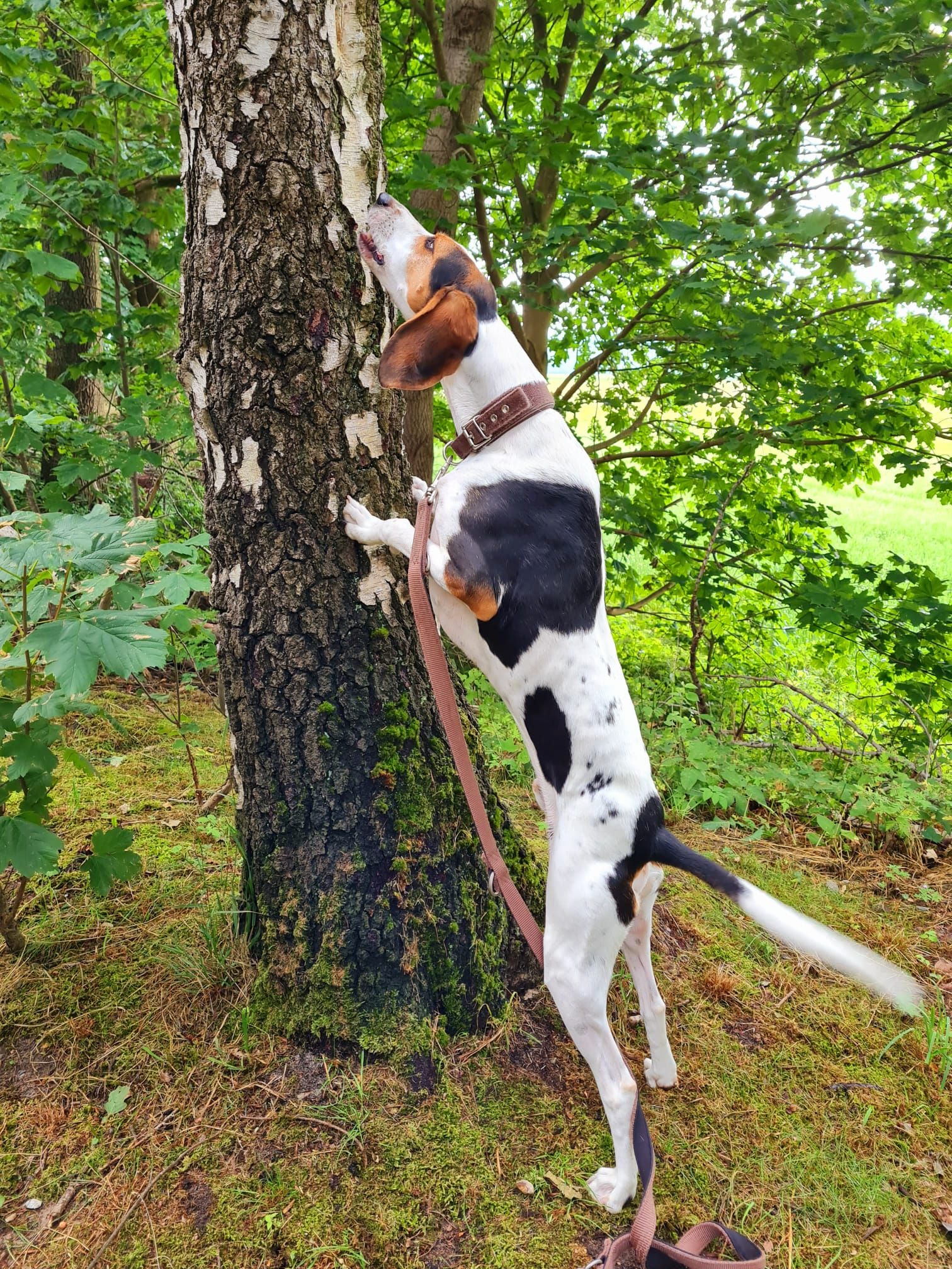 Oder nutzen Sie während des nächsten Spaziergangs im Wald die vielen Bäume für ein wenig Schnüffelspaß und Gymnastik. Einfach eine Tube Leberwurst mitnehmen, den Hund in einiger Entfernung absetzen lassen oder kurz anleinen und an einen beliebigen Baum mit etwas dickerer Burke strategisch günstig ein oder zwei Kleckse Leberwurst schmieren. Der Hund muss den Baum finden und sich am Baum ordentlich recken und strecken, um an die Leberwurst heranzukommen.