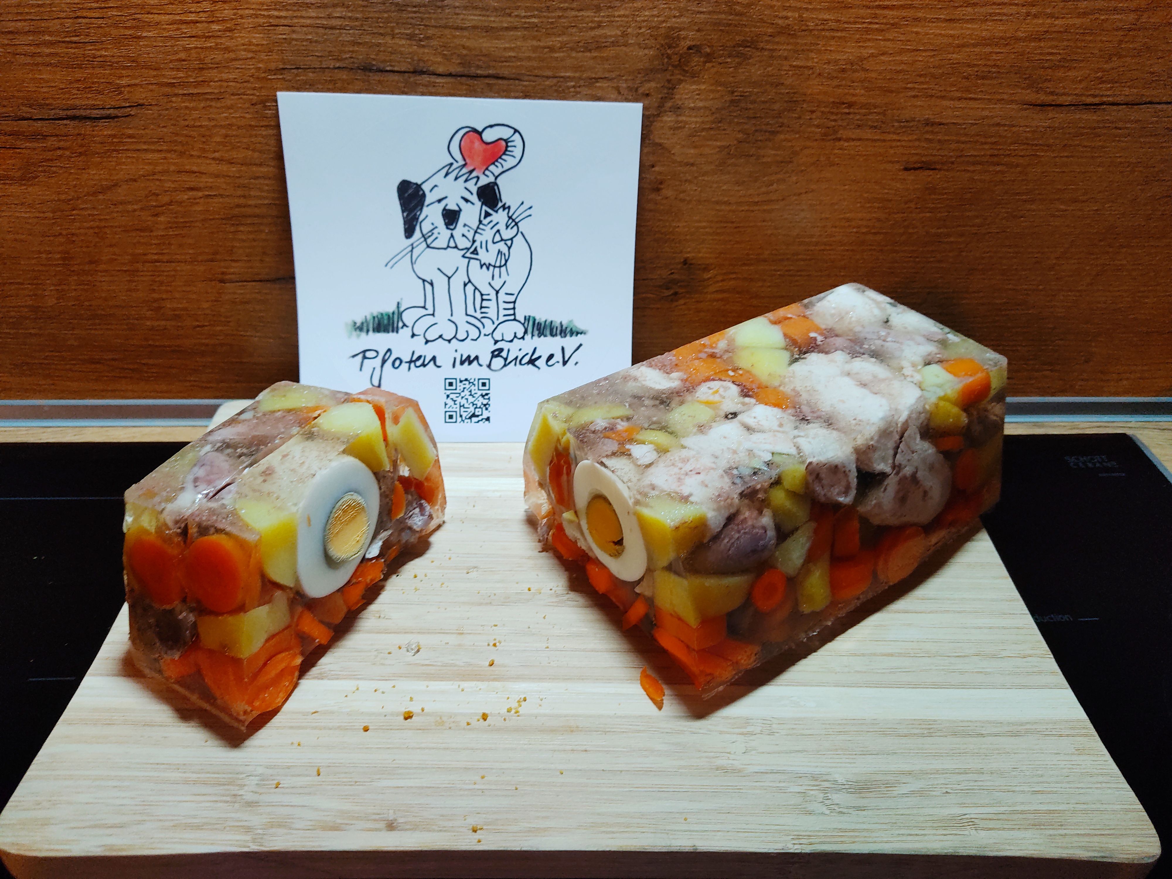 Diese Sülze eignet sich perfekt zum Konservieren in Weckgläsern. Man kann einen großen Topf kochen und die Sülze dann beispielsweise mit in den Kurzurlaub nehmen oder als Notfallreserve im Haushaltsschrank aufbewahren. Die Zutaten können nach individueller Vorliebe ausgewählt werden, eine gute Mischung aus verschiedenen Fleischsorten macht es für die Vierbeiner zu einer interessanten Geschmackserfahrung. Beim Fleisch kann man gern auch durchwachsene und fettige Stücke nehmen. Als alternatives Geliermittel kann auch Agartine verwendet werden. Gelatine wird nachgesagt, positive Wirkung auf die Gelenke und Knorpel zu haben.
