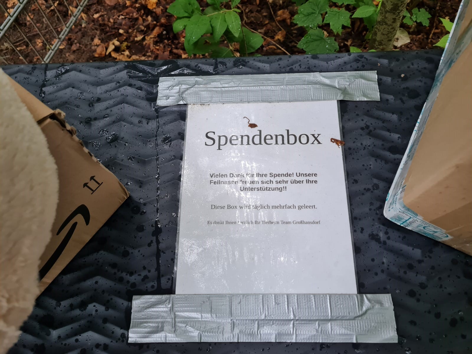 Spenden können in eine Spendenbox am Tor gelegt werden.
