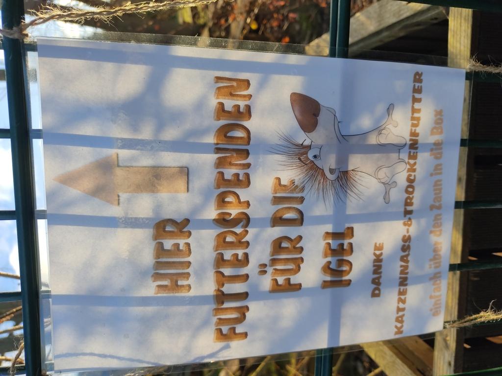 Wenn Sie jetzt in Königs Wusterhausen wohnen und noch Katzen- oder Hundefutter zuhause zu stehen haben, die Igelstation hat am Eingang auch eine Futterklappe für Spenden.